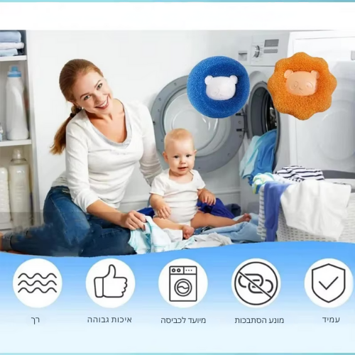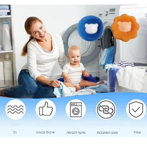 הכדור משפר את תהליך הכביסה על ידי הסרת שיער, סיבים ופסולת מהבגדים